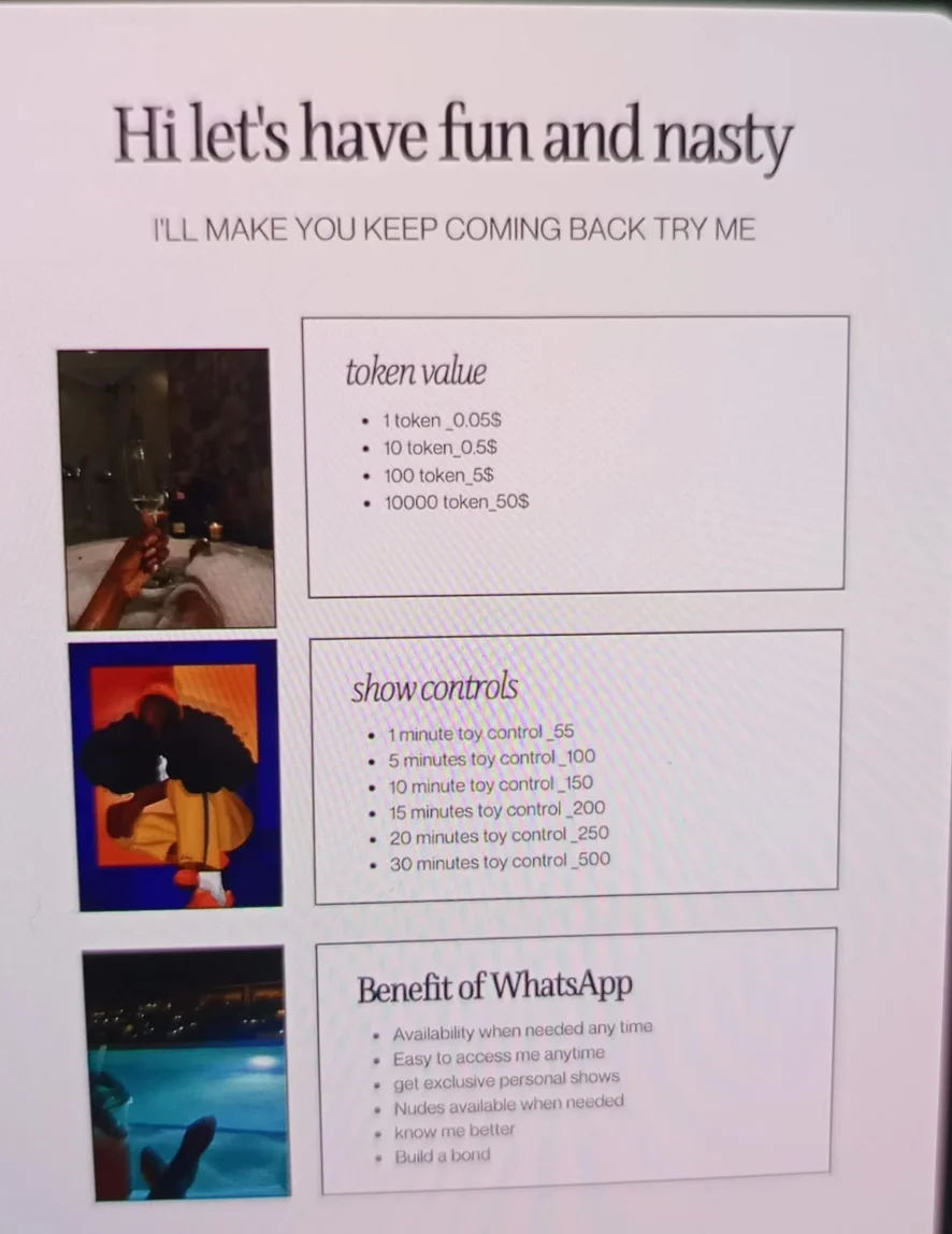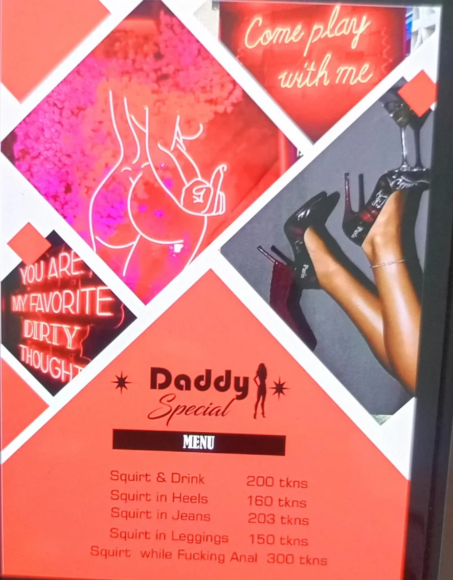 Anal, Boquete, Linguagem explícita, De quatro, Dildo ou vibrador, Exibicionismo, Masturbação, Brinquedos para mamilos, Show com óleo, Tapas, Striptease, Rebolando, Peitinhos, Anais, Do cu para a boca, Garganta profunda, Dança erótica, Penetração com dedos, Gagging, Punheta, Pegging, Fumantes, Ejaculação feminina, Brinquedos sexuais, Espiadinha por baixo, Cintaralho, Capô de fusca, Penetração dupla, Sentada na cara, Orgasmo, Gozada na cara, Posição 69, Chuveiro, Topless, Humilhação
